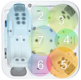 7. Зона действия донного гейзера Тайфун – мощного потока, созданного для эффективного гидромассажа ног. Плотный поток охватывает ноги от кончиков пальцев до мощных мышц бедер.