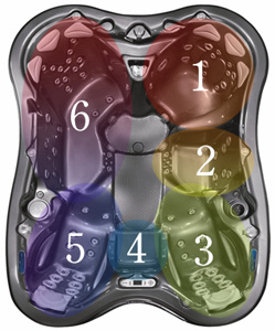3, 5. Главная гордость Dimension One Spas – эргономичные ложа с системой движения форсунок Динамический Массаж, созданные с учетом особенностей строения женского и мужского тела. 3 – мужское ложе, 5 – ложе, рассчитанное на более хрупкую женскую фигуру.