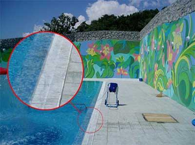 Вода все время равномерно переливается через край бассейна. Далее попадает в переливной лоток и поступает в накопительную емкость. Вода очищается, фильтруется и подается через донные форсунки обратно в в бассейн. Форсунки расположены равномерно по всей площади бассейна. Как правило переливные бассейны изготавливаются из бетона.