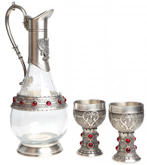 Набор состоит из бутылки и двух рюмок на ножке.