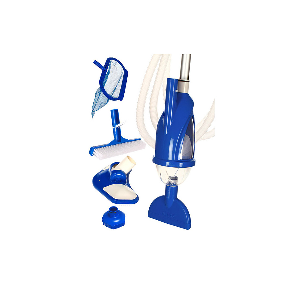 Intex 28003 Комплект для чистки бассейна - это универсальный комплект для чистки каркасного, надувного и даже стационарного бассейна. Все составляющие набора изготовлены из высококачественных и высокопрочных материалов. В комплект поставки входит мелко ячеистый сачок, для сбора различного мусора с поверхности воды, а также жестко-ворсистая щетка, для чистки дна и стенок бассейна, различные насадки для пылесоса. Огромным плюсом данного комплекта для чистки бассейнов, является то что он работает по принципу пылесоса, то есть подключается не посредственно к насосу-фильтру для очистки и рециркуляции воды в бассейне, таким образом можно начинать процесс уборки. Для полностью эффективной работы пылесоса, компания Интекс советует использовать насос-фильтр, производительностью от 3028 литров в час. К ручке, длиной в 279 сантиметров, прикрепляется гофрированный шланг, который обеспечит доступ в любую точку бассейна диаметром не больше 549 сантиметров.