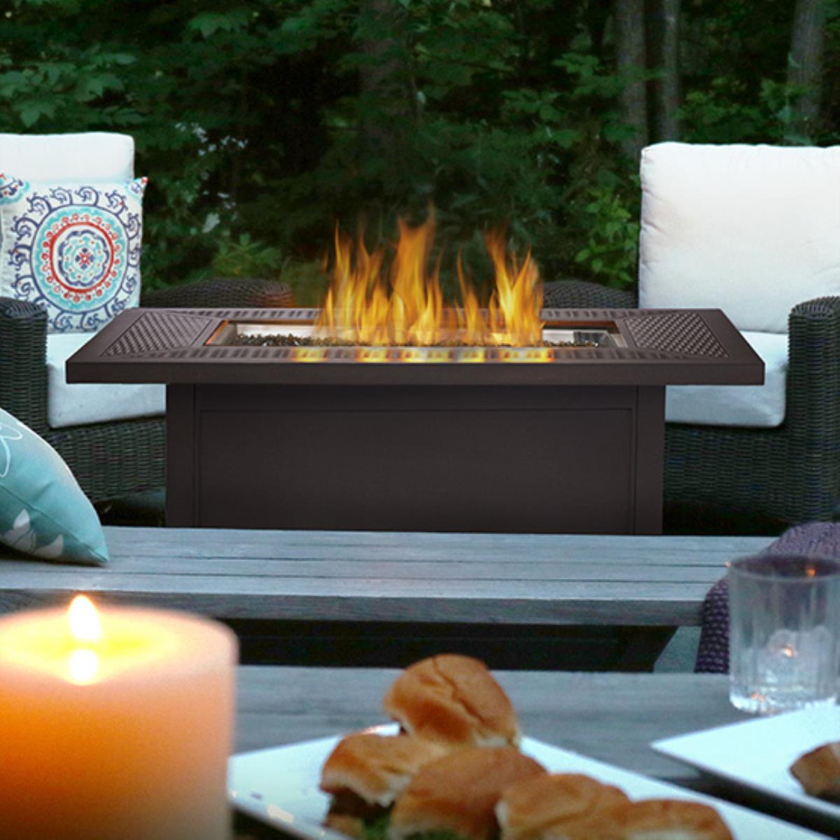 Патио Прямоугольный газовый уличный стол-камин Madrid-1 имеет бронзовую отделку, а линейная газовая горелка добавляет современный вид пламени. Стеклянные мерцающие камни отражают свет пламени согревая Вас и обеспечивают уютную атмосферу. Патио Прямоугольный газовый уличный стол-камин Madrid-1 без труда мгновенно согреет и осветит. Патио Прямоугольный газовый уличный стол-камин Madrid-1 обеспечивает прекрасный уютный мерцающий огонь и свет. Баллон для пропана скрывается за эргономичной дверцей самого патио стола-камина. Термо-клапан установленный в патио Madrid-1 обеспечивает функцию безопасности, он отключает газ когда пламя нарушается, но также экономит пропан предотвращая утечку газа, как только пламя погаснет. О погоде также беспокоится не нужно. Дренажные отверстия в горелке из нержавеющей стали позволяют дождевой воде рассеиваться, если Вы случайно забыли наkрыть крышкой стол.
