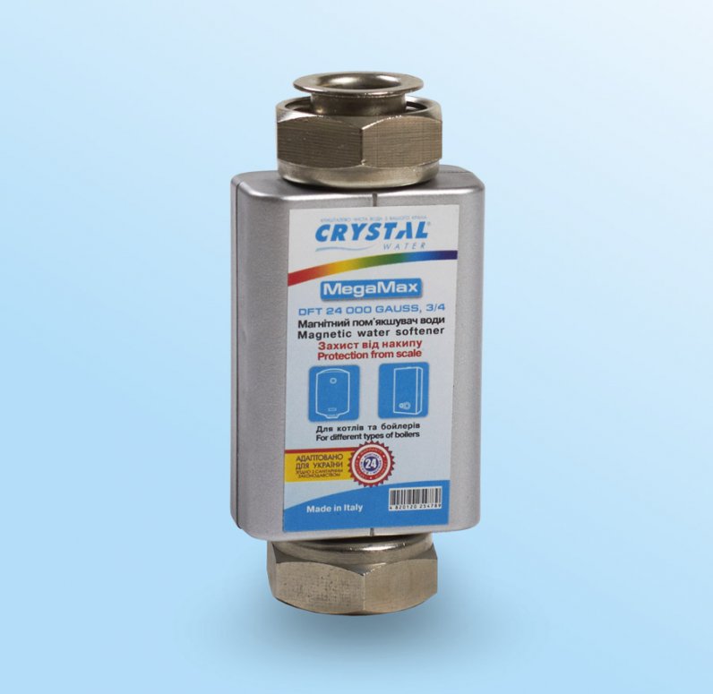 Магнитный фильтр CR-MMAX 1/2"-1/2" не требует расходных материалов (наполнителей). Магнитный фильтр CR-MMAX представляет собой металлический блок с резьбой стандартных размеров (1/2", 3/4") на торцах. Внутри находится система постоянных магнитов особой пространственной конфигурации в гидроизоляционном корпусе. Поток воды проходит через фильтр под воздействием сильного магнитного поля, в результате чего происходит изменение физических свойств воды. Силикаты, кальциевые и магниевые соли под действием магнитного поля теряют способность формироваться в воде в виде плотного камня. После подогрева они выделяются в виде шлама и легко удаляются водой. Обработанная вода удаляет уже имеющуюся накипь, формирует из прочного кристаллического кальцита более мягкий раствор, который смывается водой. Магнитный фильтр CR-MMAX 1/2"-1/2" предназначен только для бытового применения.