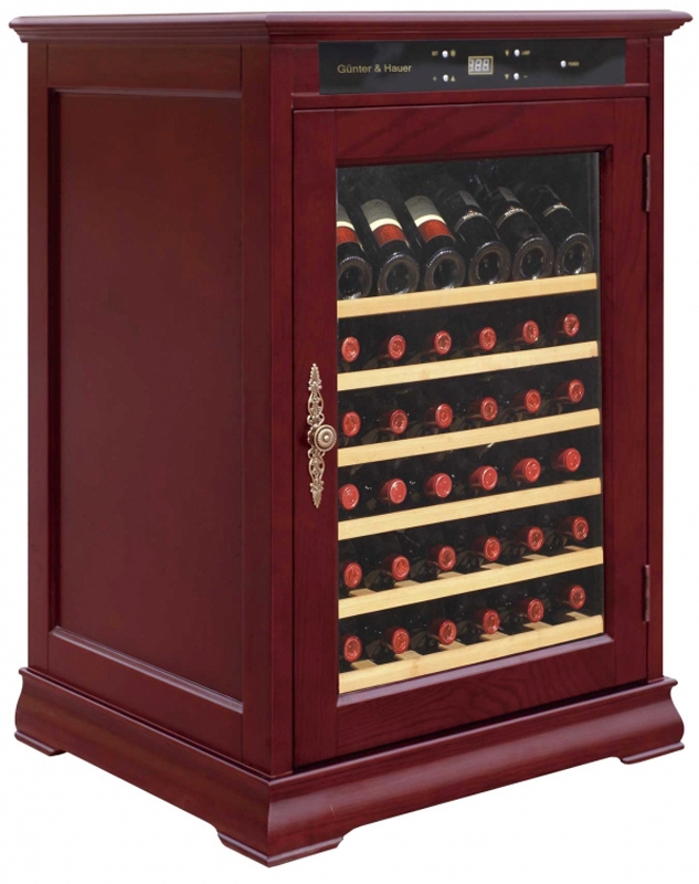 Винный шкаф Gunter&Hauer WK 138 A C3 - 48 бут., корпус американский дуб, контроль температуры компьютер.Винный шкаф Gunter&Hauer WK 138 A C3 имеет рег.темп. 5-22С.Винный шкаф Гюнтер и Хауэр это также стекло с защитой от ультрафиолетовых лучей, антивибрационная система компрессора, 5полок, (ВхШхГ,см) 103х72х62,эл. кВт/ч в сутки 0,8,цвет махагон