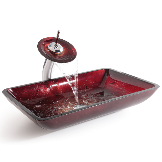 Прямоугольный умывальник выполнен в цветах красного металика с черными вкраплениями.