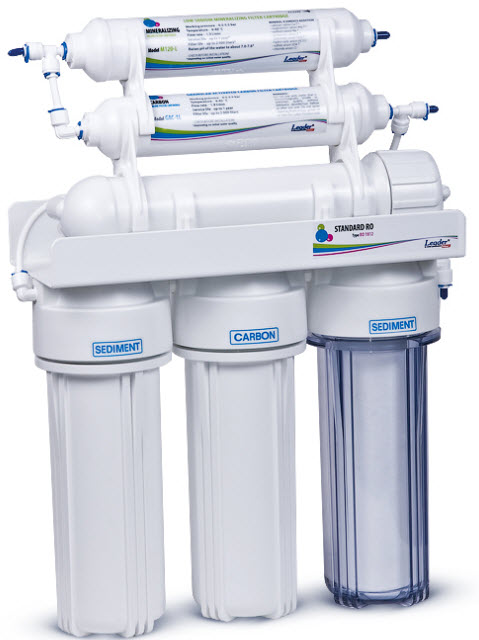 Leader modern ro 6 – дополнительно оборудован минерализирующим картриджем и двойным краном в стиле хай-тек. Главное назначение минерализатора обогатить воду минеральными солями, необходимыми для человеческого организма, такими как хлориды и бикарбонаты кальция, магния натрия и калия. А также нормализовать уровень рН. Фильтр также комплектуется двойным краном, что позволяет использовать чистую и минерализированную воду отдельно.