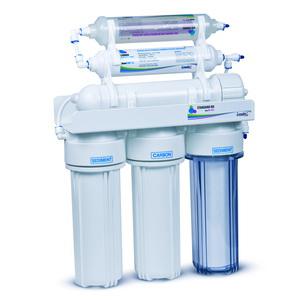 RO-5 с биокерамикой (структуризатор) компактная система обратного осмоса, предназначенная для индивидуального контролирования качества питьевой воды. Преимуществом системы обратного осмоса Leader Standart RO-5 является использование 5-ступенчатой технологии очистки воды, разработанной в Польше. Система изготавливается только из первичного сырья, для соединения используются быстроразъемные соединения фирмы John Guest, что дает дополнительную надежность осмотического фильтра. Стандартные осмотические мембраны имеют площадь 1,5м2. Следует помнить, что с понижением температуры (ниже 25°C) понижается производительность осмотической мембраны – понижение температуры на 1 градус снижает производительность обратного осмоса на 3%. Падение производительности мембраны прямо пропорционально падению давления.